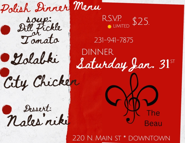 - Saturday Jan 31st ~open 6 pm 6 -7:30pm polish dinner R.S.V.P. limited $25 includes full dinner and dessert call or text 231-941-7875 ~ 7:30 pm Live Music by Evan Archambo